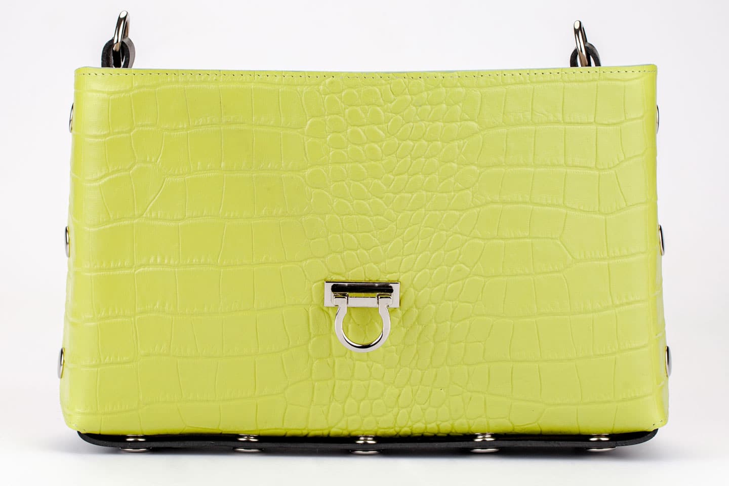 Перфектно решение за Вашия стайлинг – сменяема лицева част изработена от естествена кожа в кроко принт в зелено.