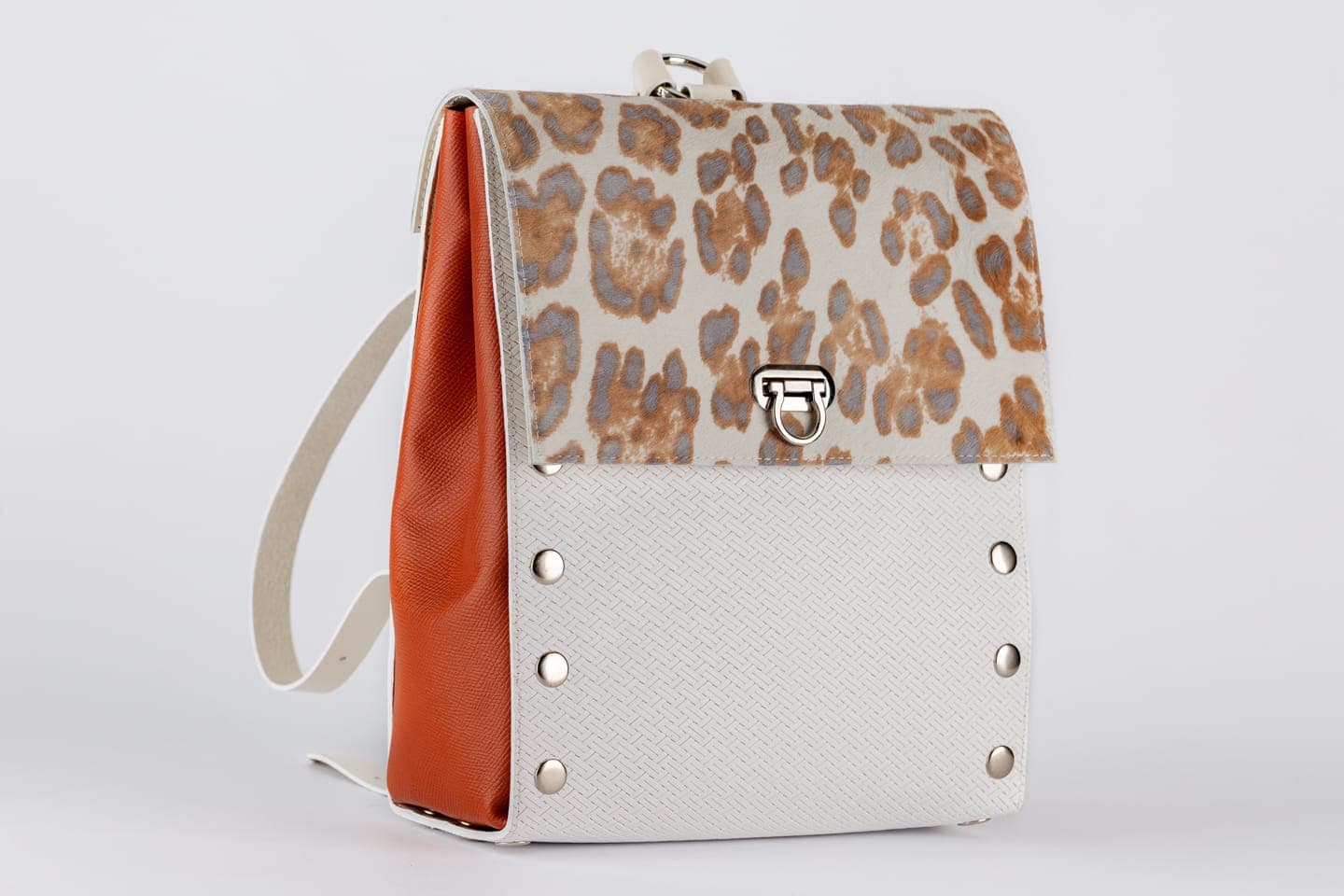 Основата е изработена от висококачествена италианска кожа в бяло, а страните са от кожа в керемиден цвят.