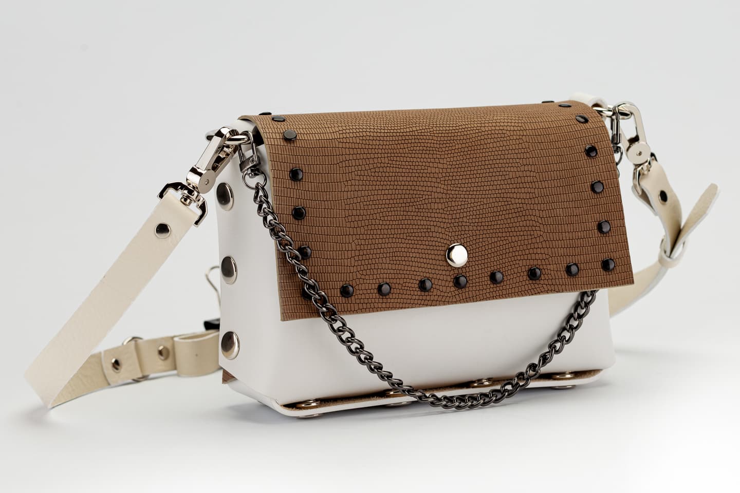 Лицевата част и дъното са изработени от висококачествена италианска кожа в бяло.