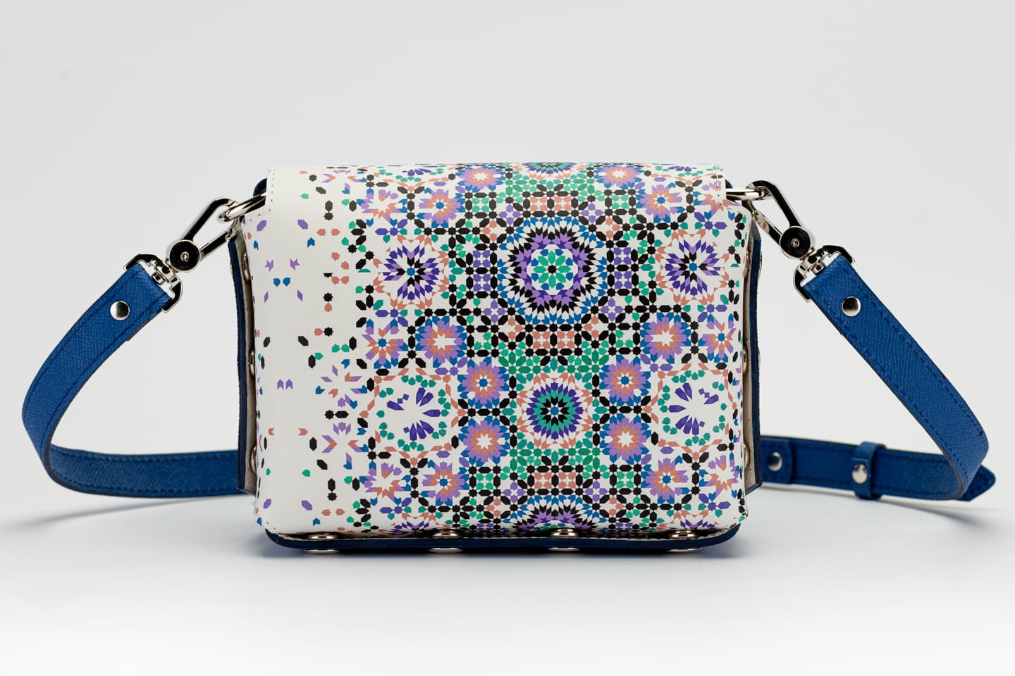 Лицевата част и дъното са изработени от висококачествена италианска кожа в син цвят.