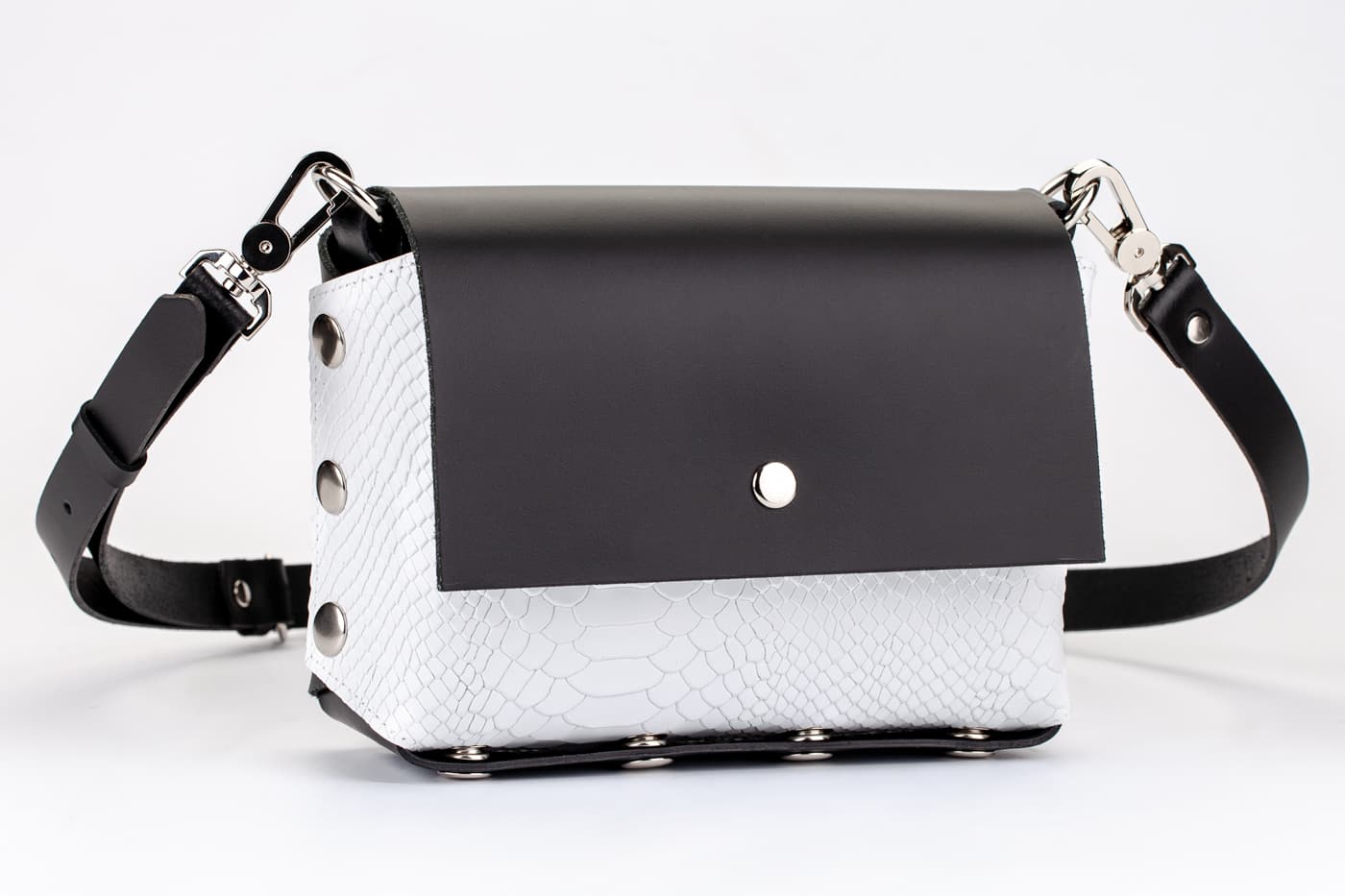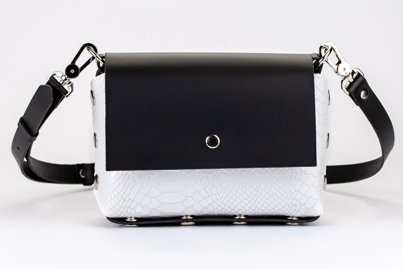 Модел Selin с лицева част от естествена кожа в кроко принт в бяло.