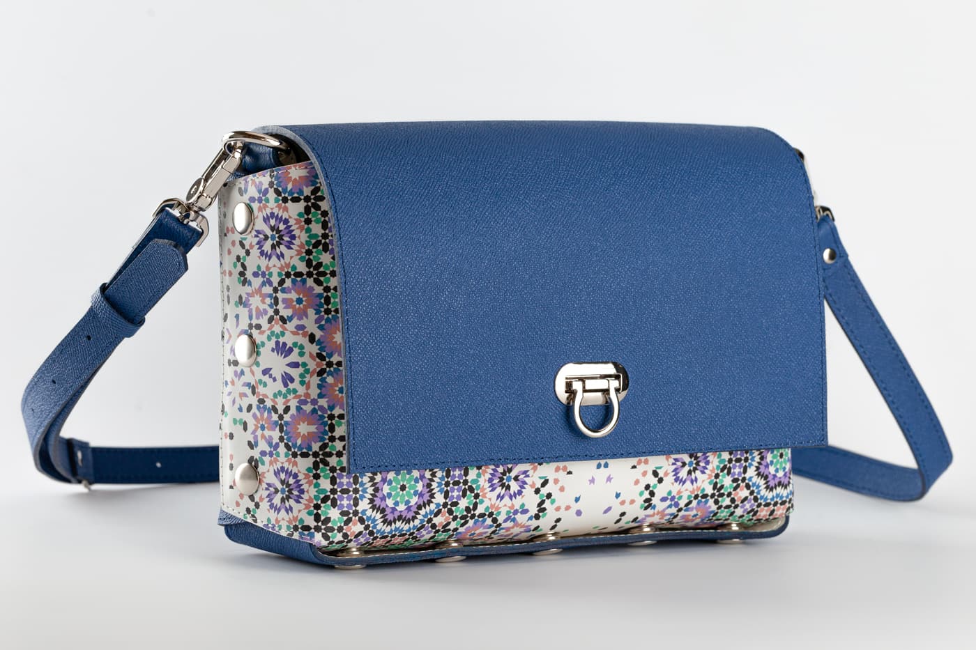 Модел Valena с лицева част от естествена кожа в цветен принт.