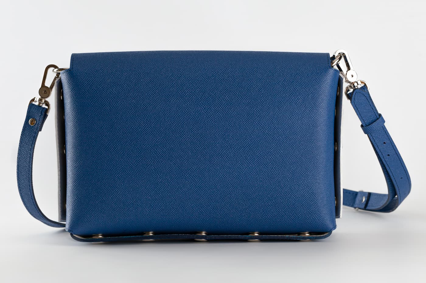 Дъното и капака са изработени от висококачествена италианска естествена кожа в син цвят.