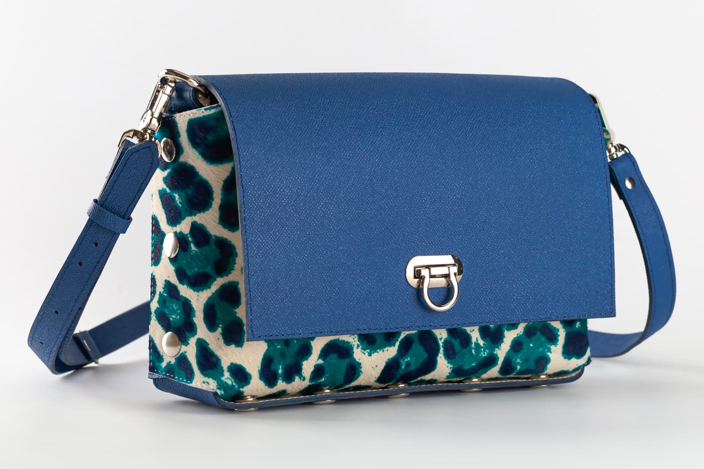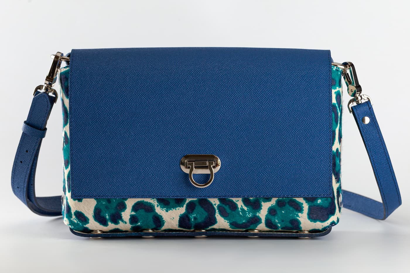 Модел Valena с лицева част от естествена кожа от пони с цветен принт.