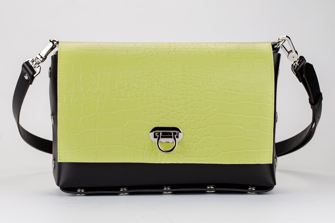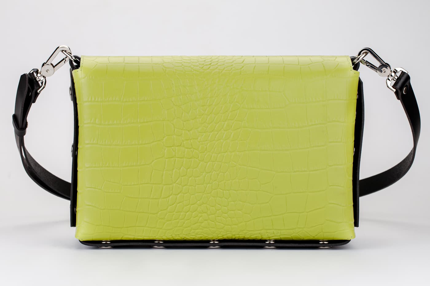 Модел Valena с капак от естествена кожа в кроко принт в зелено.