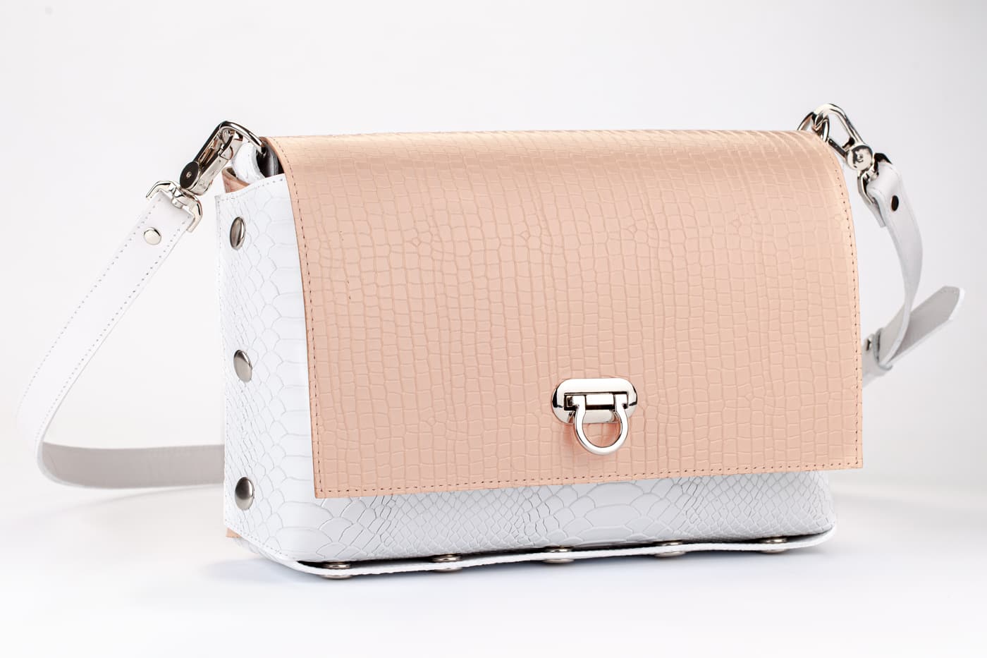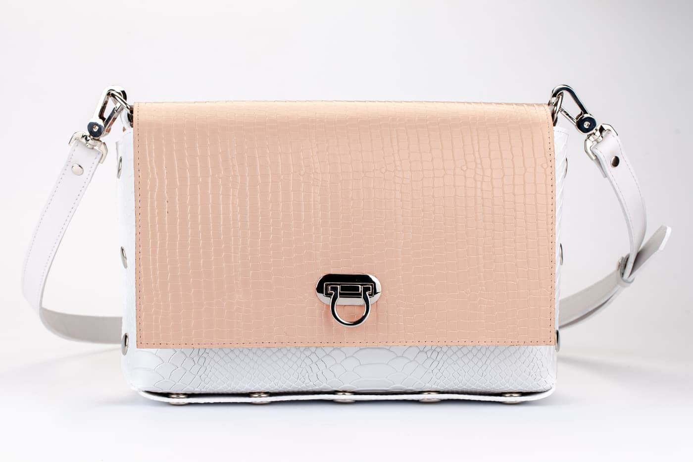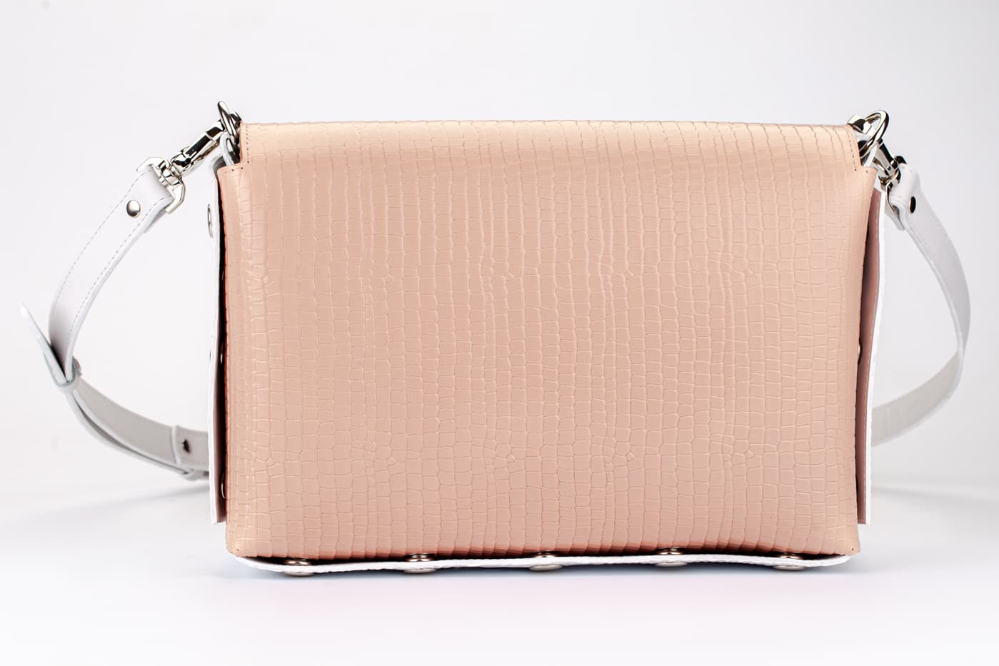 Лицевата част и дъното са изработени от висококачествена италианска кожа в кроко принт в бял цвят.