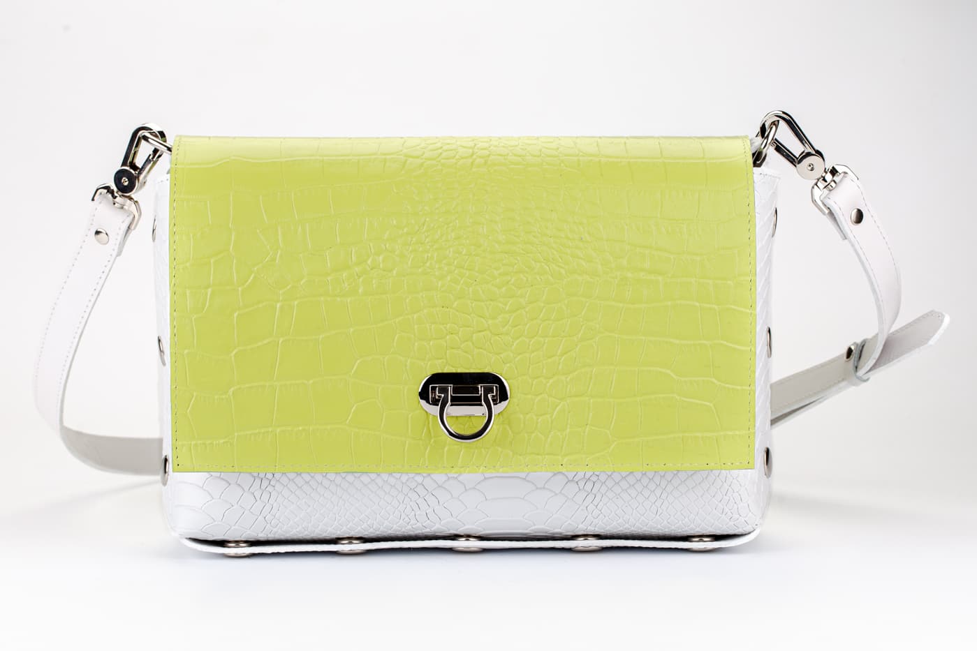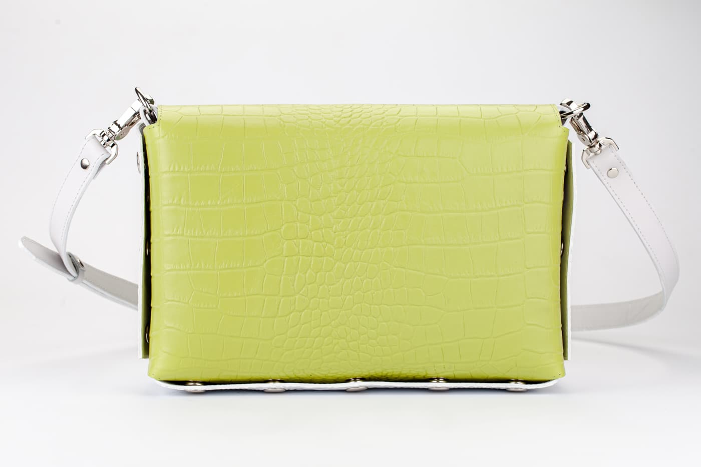 Лицевата част и дъното са изработени от висококачествена италианска кожа в кроко принт в бял цвят.