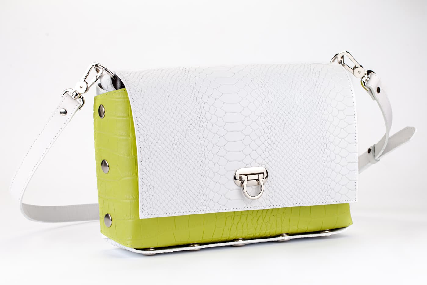 Дъното и капака са изработени от висококачествена италианска естествена кожа в кроко принт в бял цвят.