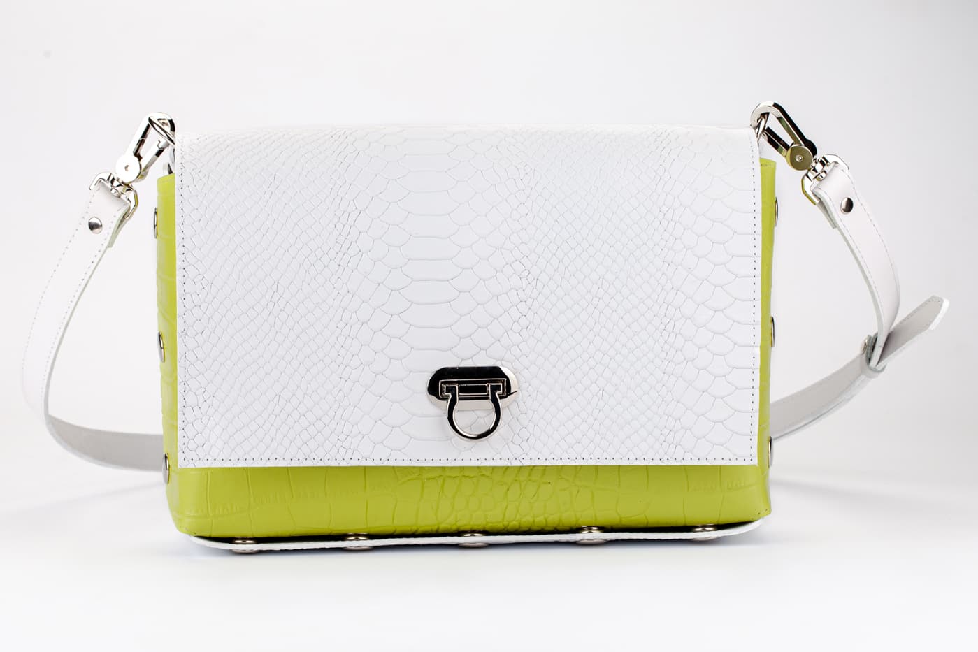 Модел Valena с лицева част от естествена кожа в кроко принт в зелено.