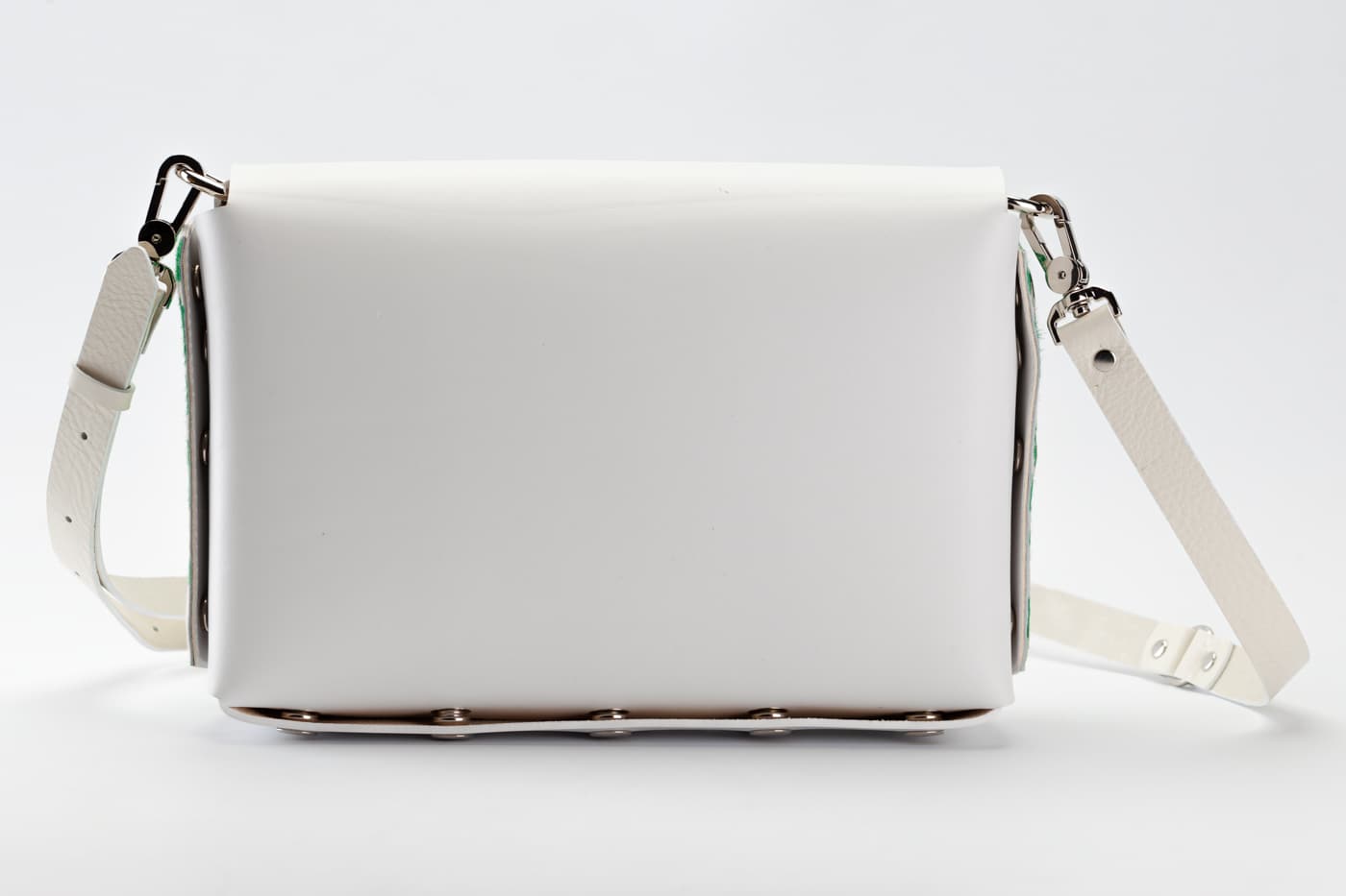 Дъното и капака са изработени от висококачествена италианска естествена кожа в бял цвят.